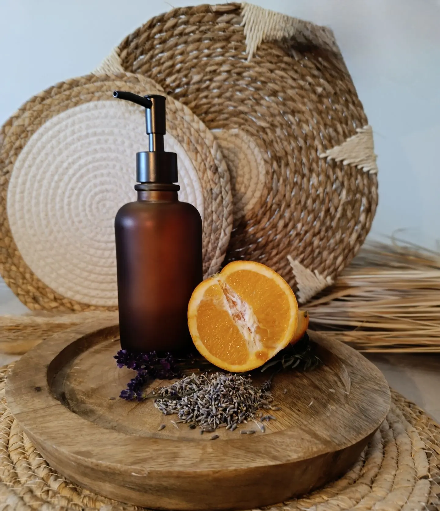 Compositions : huile végétale d'amande douce, HE de lavande officinale et HE d'orange douce. (HE très faible pourcentage, aucun risque pour les futurs bébé/enfant).